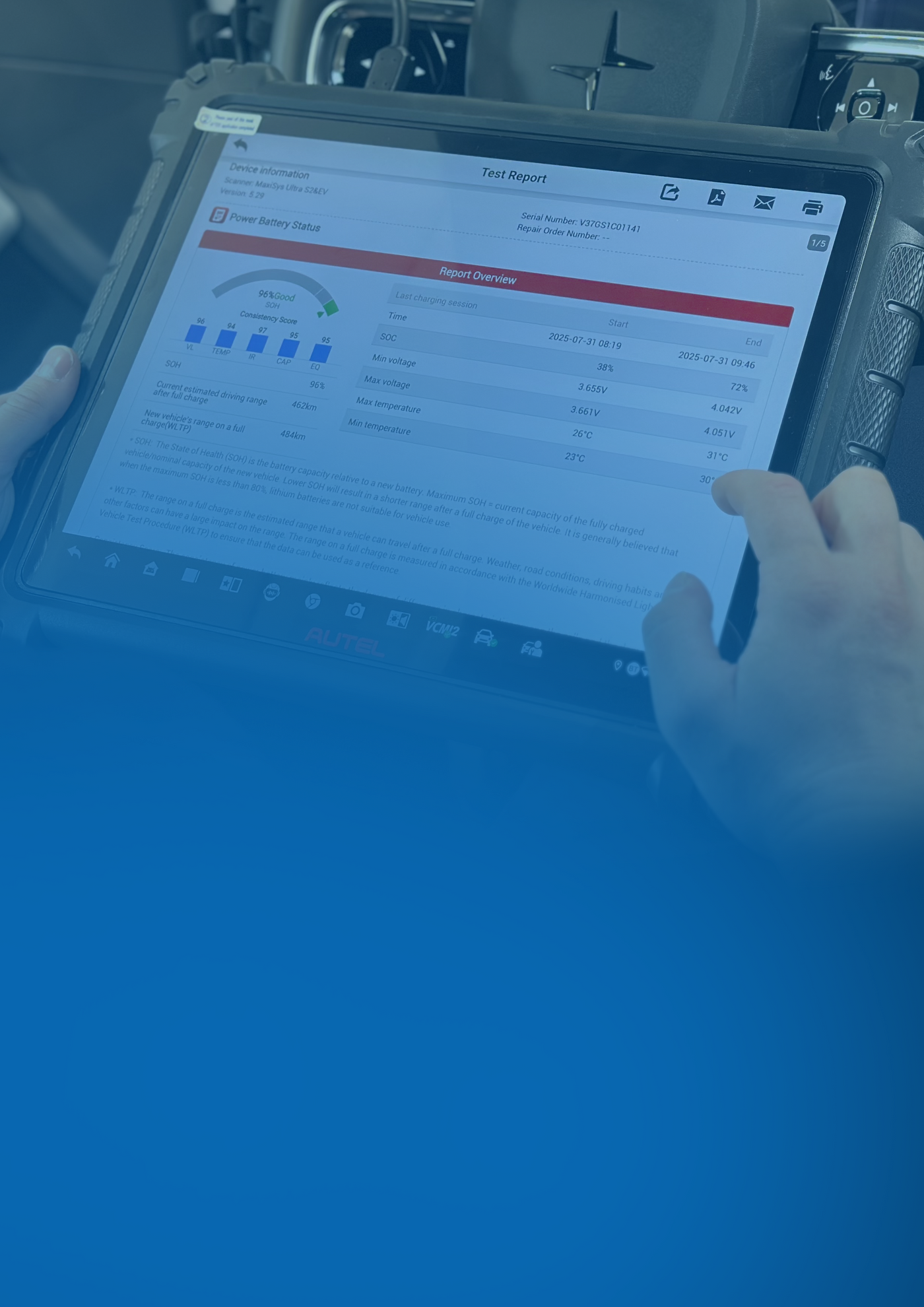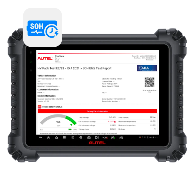En SOH-test måler batteriets kapacitet og tilstand ved at analysere en række nøgleparametre. Under hele opladningen overvåger Autel-systemet konstant batteriets parametre, herunder spænding, strøm, temperatur og opladningseffektivitet.