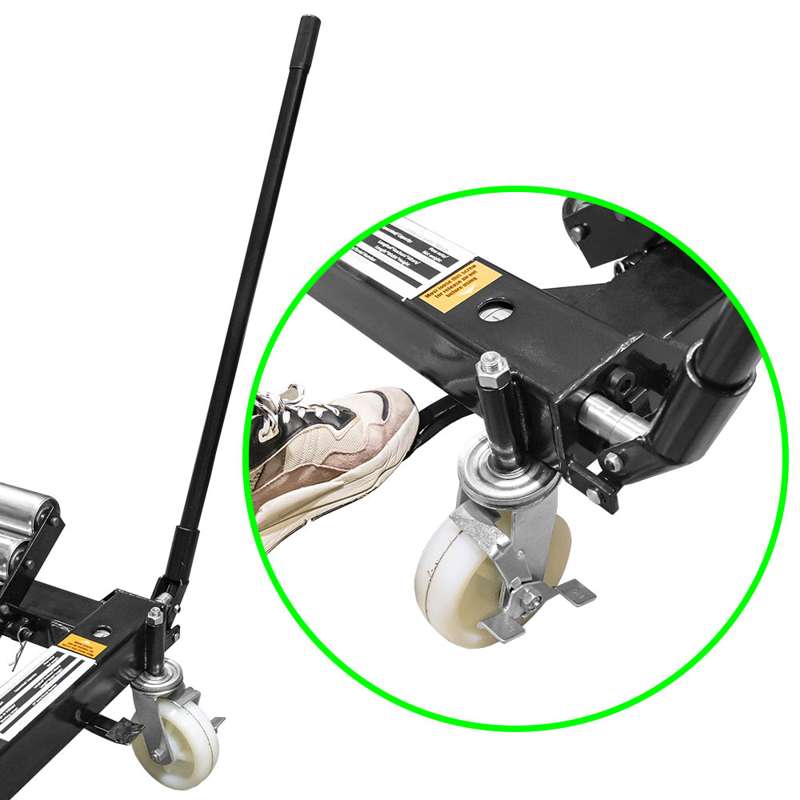 Dækvognen er udstyret med PU-beklædte hjul, som sikrer høj modstandsdygtighed og forhindrer mærker på værkstedsgulve. En øvre sikkerhedskrog holder dækket på plads under transport og øger sikkerheden. Den hydrauliske løftefunktion gør det nemt at justere højden fra 0 til 770 mm, så den passer til forskellige dæktype og arbejdsopgaver.
